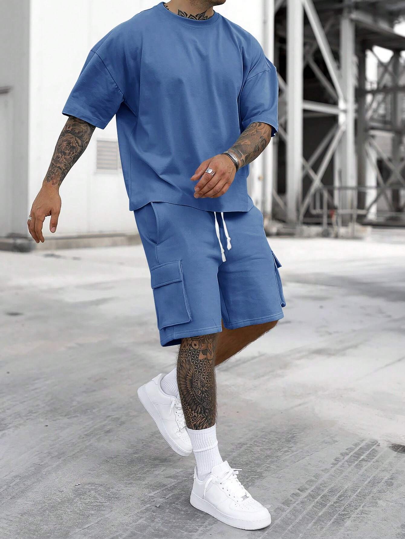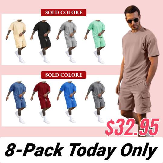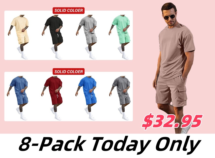 [S-6XL] Men's Solid Tee & Cargo Shorts Set