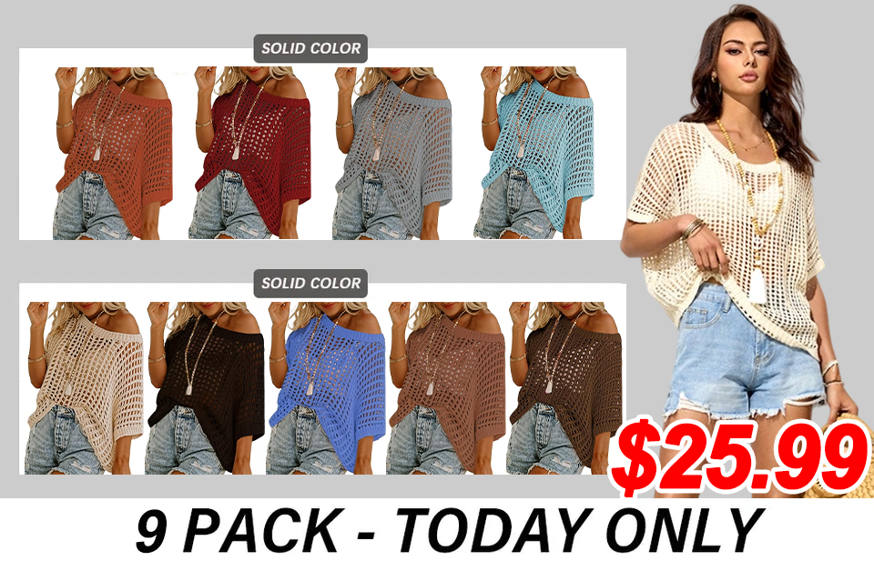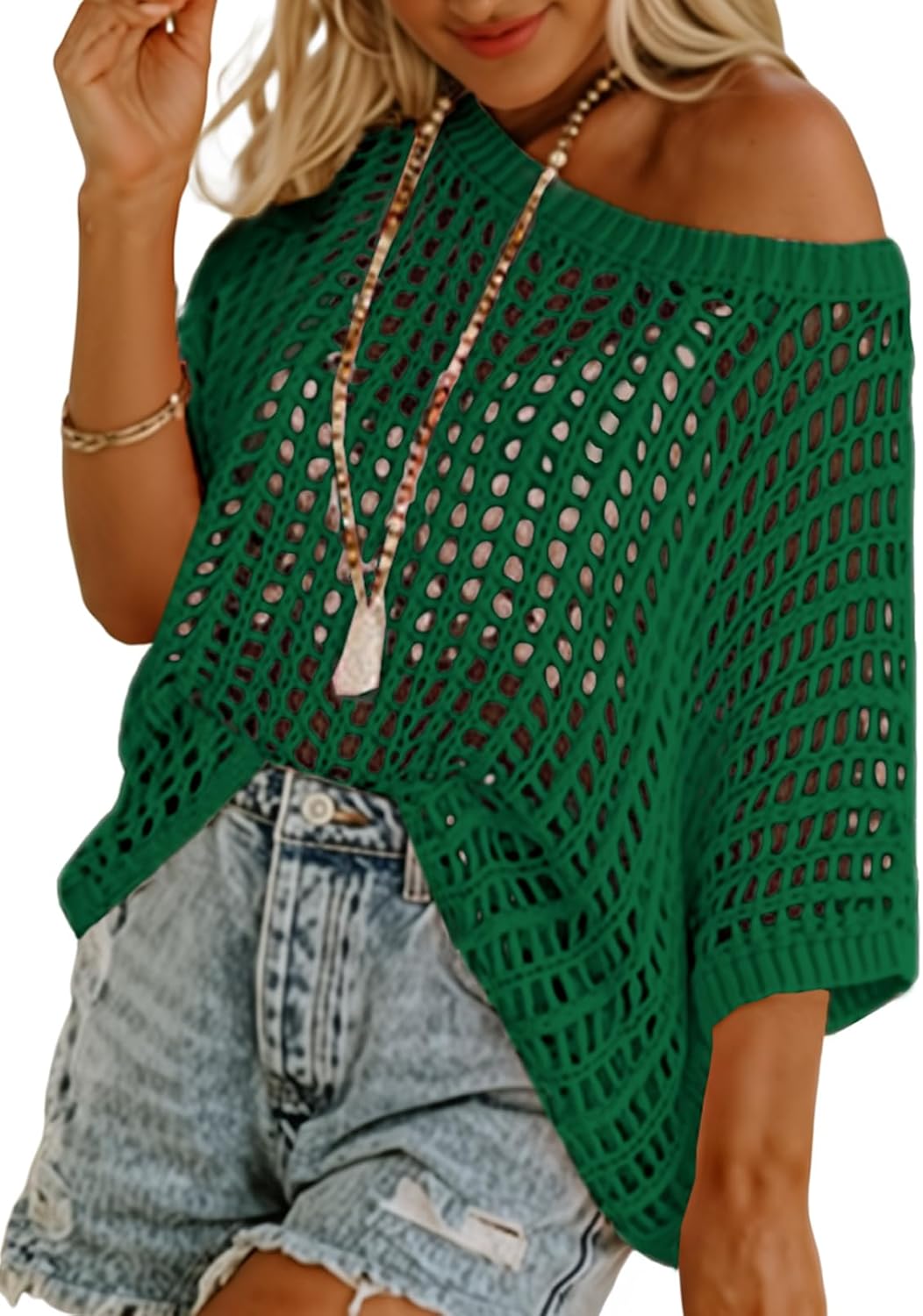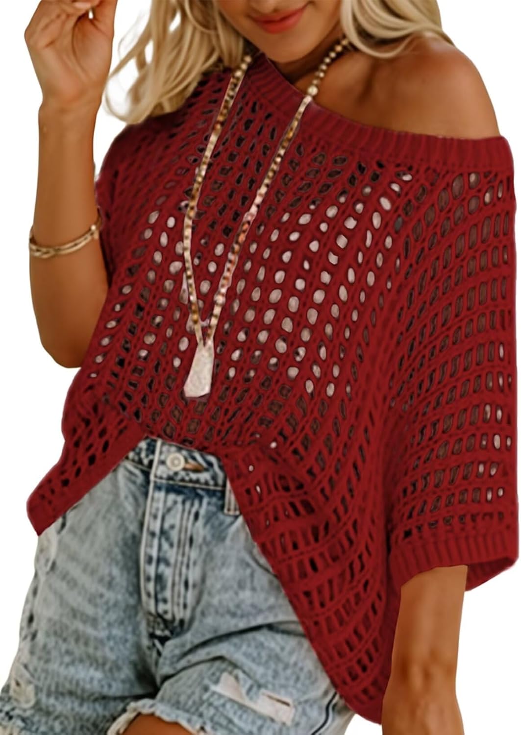 Womens Summer Scoop Neck Short Sleeve Sweater Casual Crochet Hollow Out Knit Tops Pullover Shirts Beach Coverup